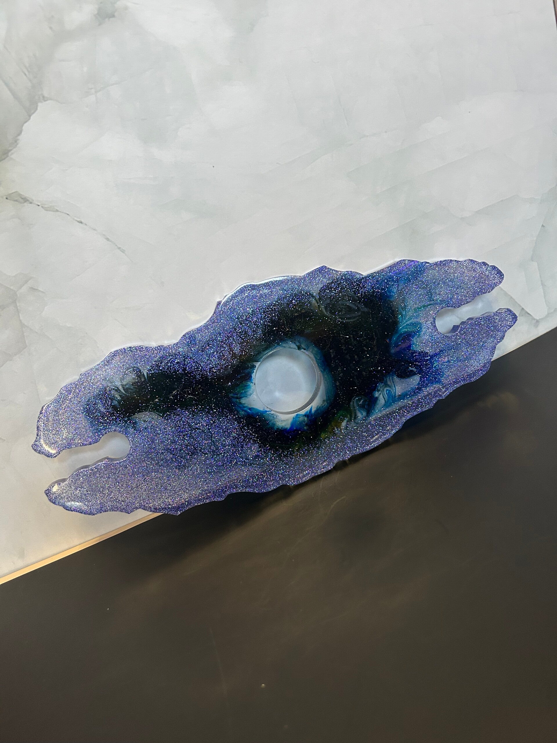The design features a captivating blend of deep indigo, obsidian black, and shimmering violet glitters. The organic, fluid swirls within the resin mimic the look of a distant galaxy, ensuring that no two butlers are ever exactly alike.